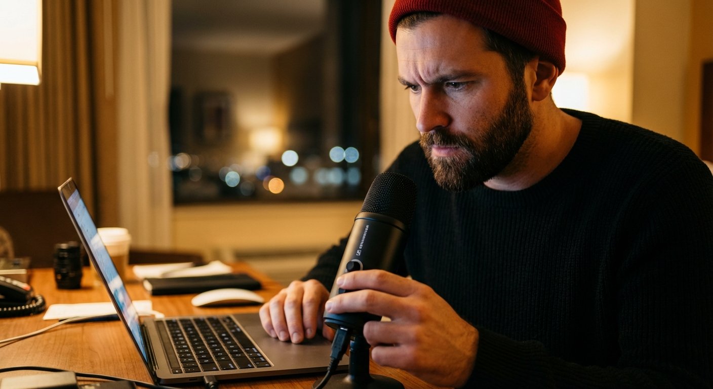 You need a dedicated device. But you are traveling. You cannot carry a studio arm and a heavy XLR interface in a carry-on.
