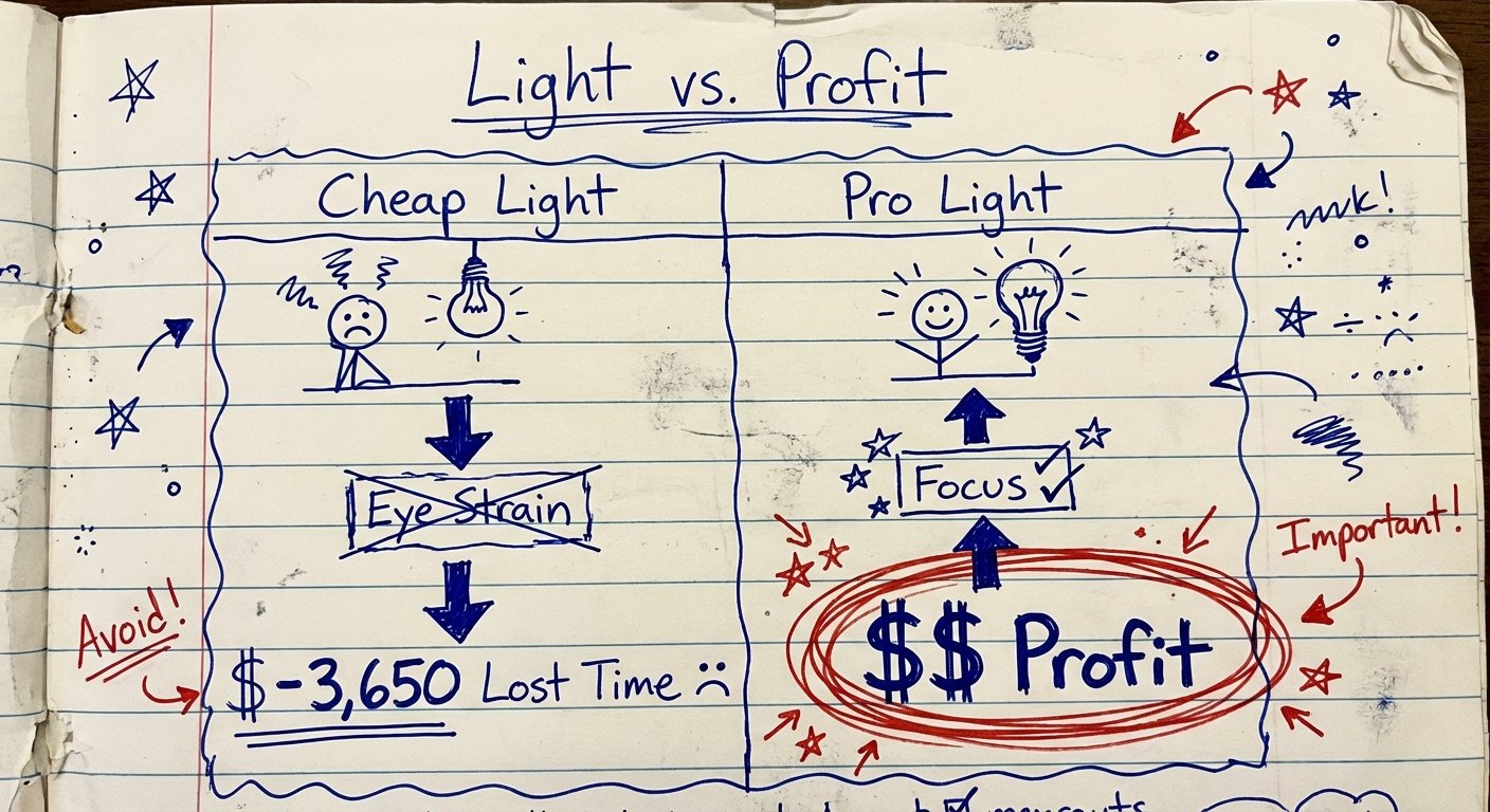 But that cheap light has a low CRI (Color Rendering Index). It flickers invisibly. It causes eye strain.
