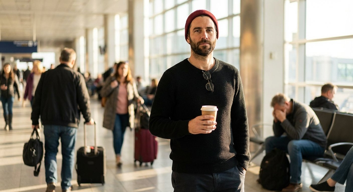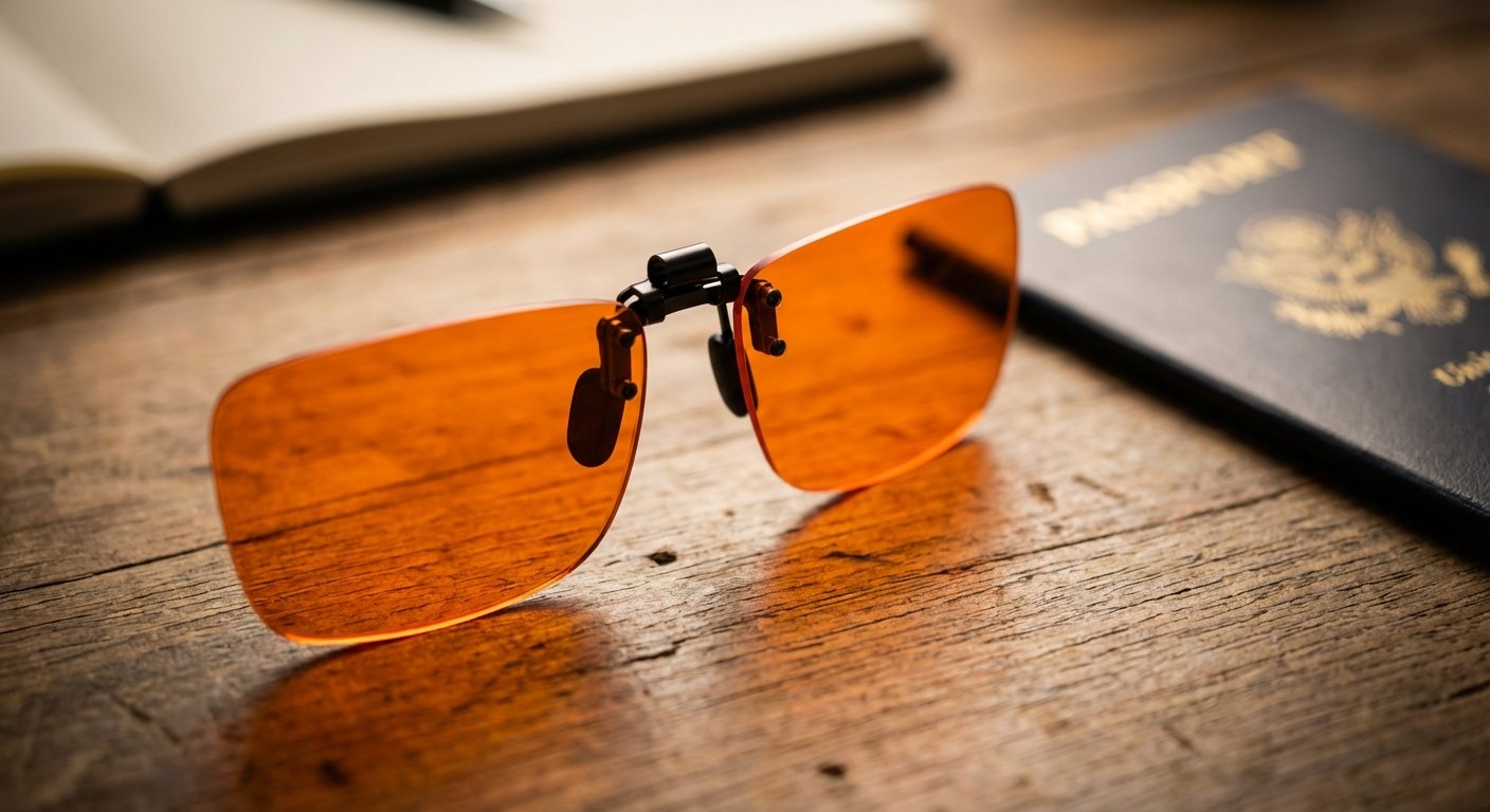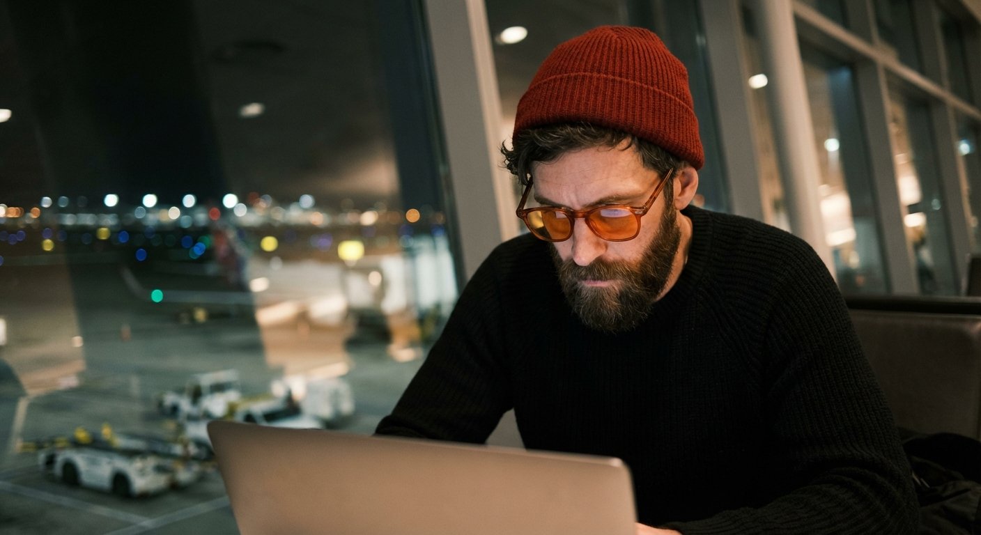Airport terminals are the enemy. They use “cool white” LEDs to keep staff awake. This destroys your rhythm. Glasses on immediately.