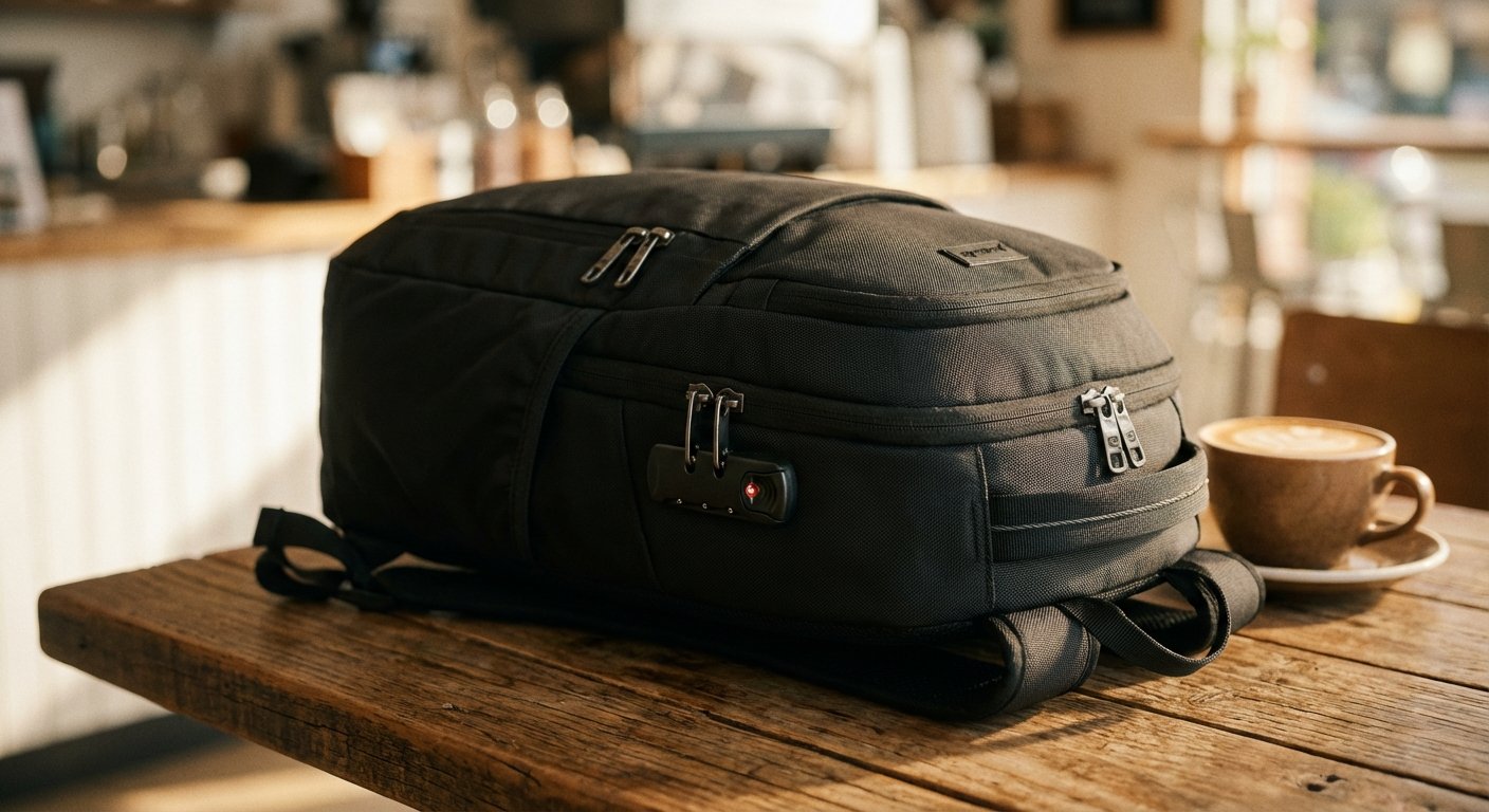 It has steel mesh inside the fabric. You can’t slash it. It has a locking cable. You strap it to the table leg.