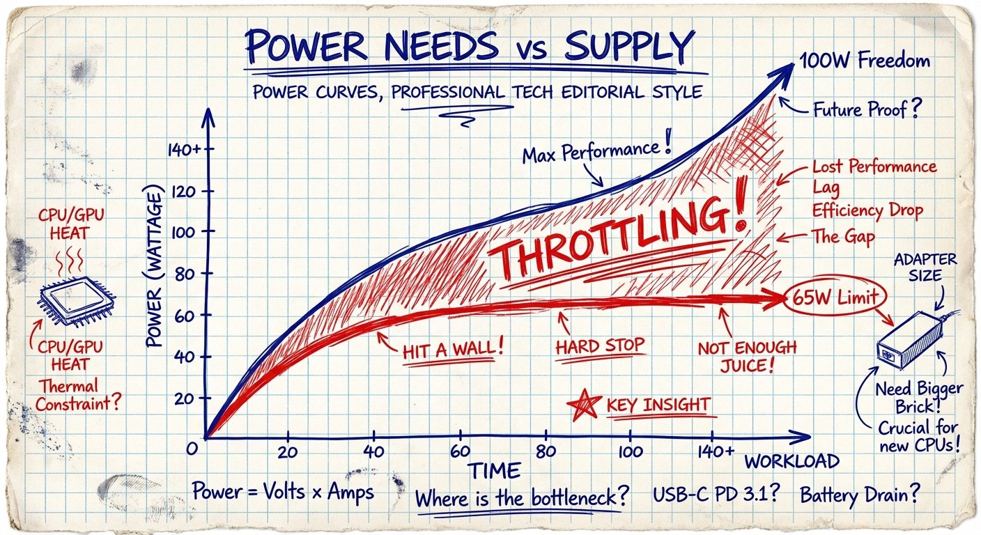 When you plug two things into a 65W charger, the math breaks. The power splits. Your laptop drops to 45W. Your phone gets 20W.