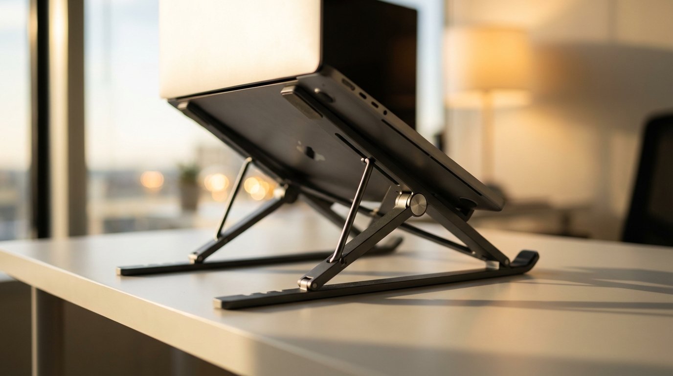 When you get to the desk, you pop it open. Your screen is now at eye level. Your neck stops hurting. Your endurance increases. You can work 10 hours instead of 6.